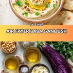 This Air Fryer Baba Ganoush recipe offers a smoky, creamy Middle Eastern dip made from roasted eggplants and garlic, blended with tahini, lemon juice, and Greek yogurt. Cooking the eggplants and garlic in the air fryer gives them a perfect charred exterior and tender interior, enhancing their natural flavors. Finished with toasted pine nuts, sumac, and fresh herbs, this recipe is a delicious and healthy appetizer or snack.