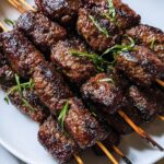 3. Form Koftas: With damp hands, take about ½ cup of the meat mixture and shape it into a cylinder around a skewer. Repeat this until all the mixture is used, forming approximately 12 kofta kebabs.