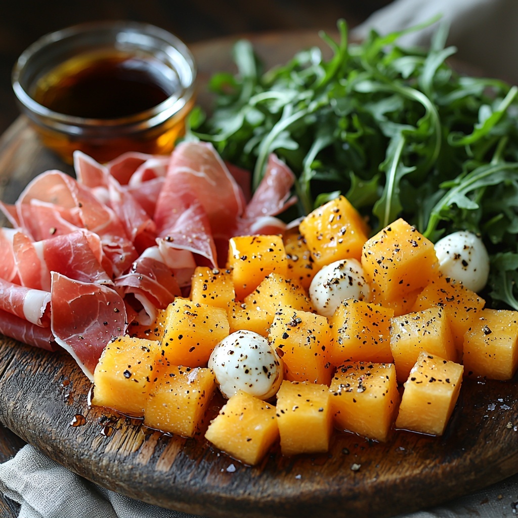 A refreshing and elegant appetizer combining sweet, juicy cantaloupe with savory prosciutto, creamy fresh mozzarella, and peppery arugula, drizzled with olive oil and optionally finished with balsamic glaze. Perfect for a quick, no-cook dish ideal for summer gatherings or light meals.