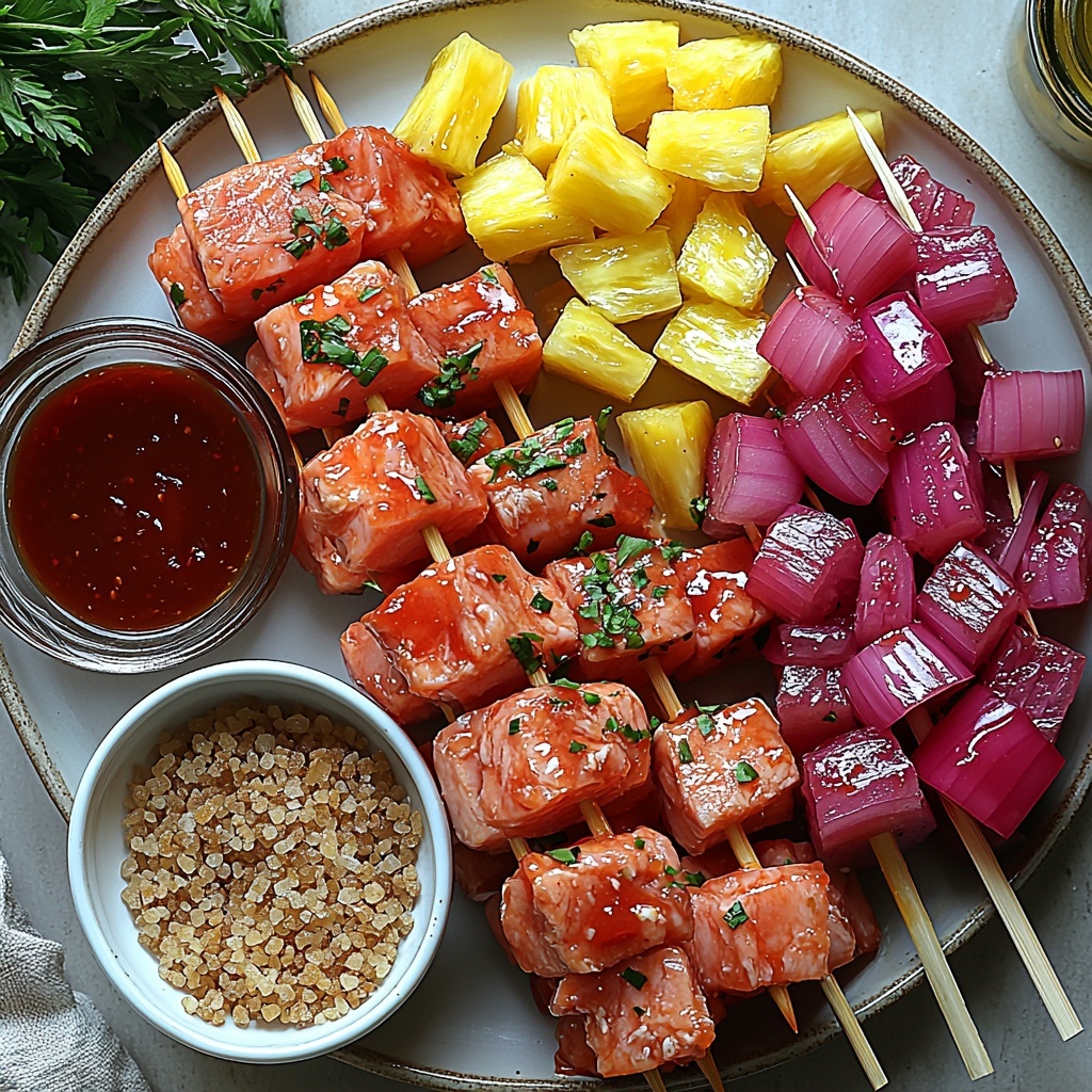 Start by whisking together soy sauce, pineapple juice, brown sugar, ketchup, rice vinegar, minced garlic, and fresh grated ginger in a medium bowl. This marinade is your secret weapon, blending sweet, salty, tangy, and aromatic notes that soak into every chicken piece. It sets the flavor profile for your Hawaiian Chicken Kebabs Recipe and promises tender, flavorful bites.