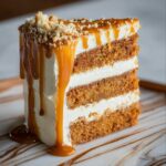 While this cake is best served chilled or at room temperature, you can gently warm a slice in the microwave for about 10 to 15 seconds to soften the frosting slightly and enhance the caramel drizzle’s flavor notes.