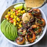Now it’s time to assemble these gorgeous bowls. Divide the cooked rice evenly between two bowls. Layer on the grilled shrimp, spoon generous amounts of mango salsa over the top, and add creamy avocado slices. Finally, drizzle the lime-chili sauce over everything and sprinkle with extra fresh cilantro. Serve immediately with lime wedges to squeeze over each bowl for an extra hit of brightness.