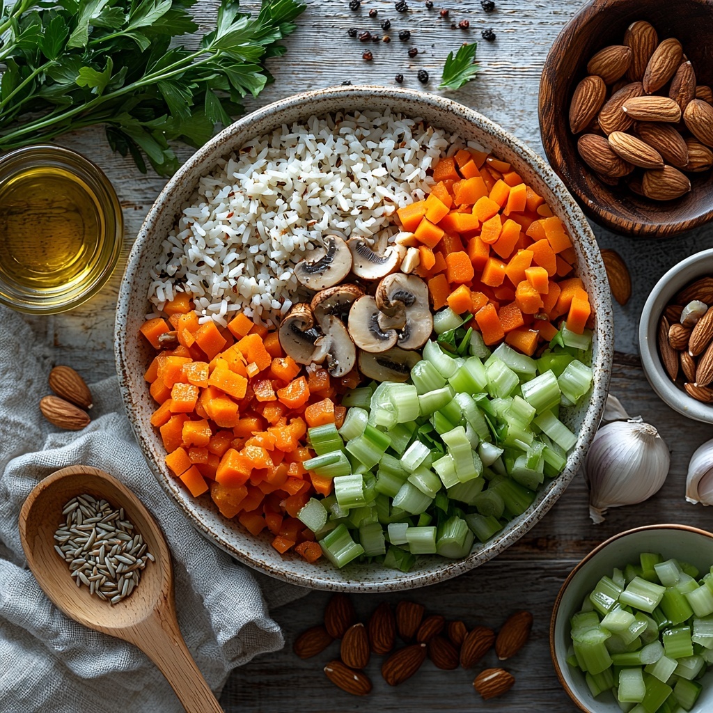 This Wild Rice Pilaf with Cranberries, Nuts, and Vegetables Recipe comes together with a handful of simple, well-chosen ingredients. Each one plays an essential role in creating the perfect balance of flavors, textures, and colors to make your pilaf shine. Here’s what you’ll need:
